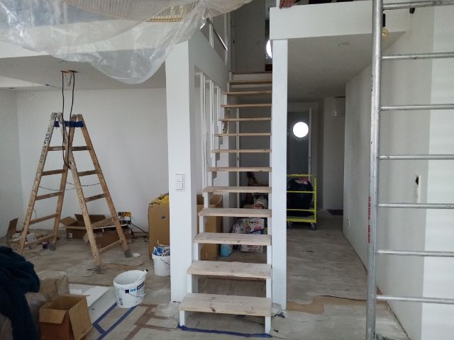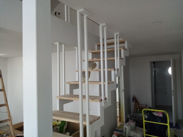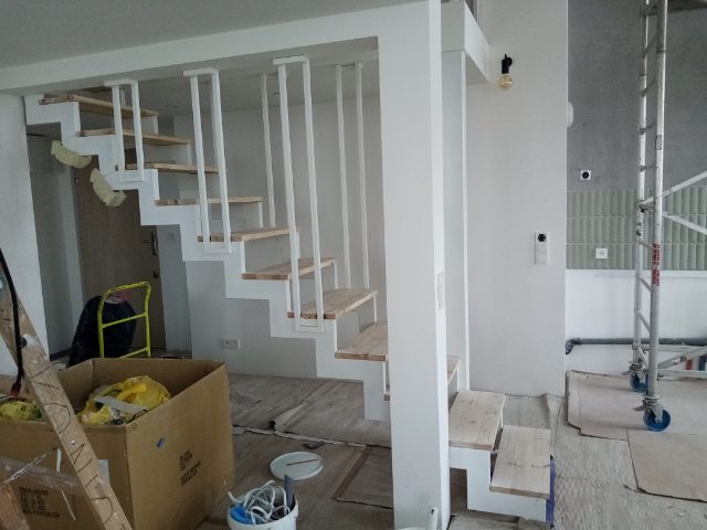 Barierka stalowa malowana proszkowo na biało. Montowana na antresoli. Dodatkowo wykonana balustrada schodowa w nietypowym kształcie.